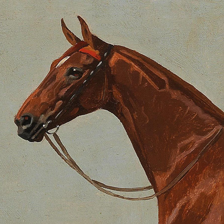 Beautiful 1800s Horse Portrait by Dutch Master Emil Volkers features a beautiful chestnut horse with a rich balance of warm and red tones. This piece presents beautifully in a dark modern or gold frame as well as classic old-world style gold ornate frames.