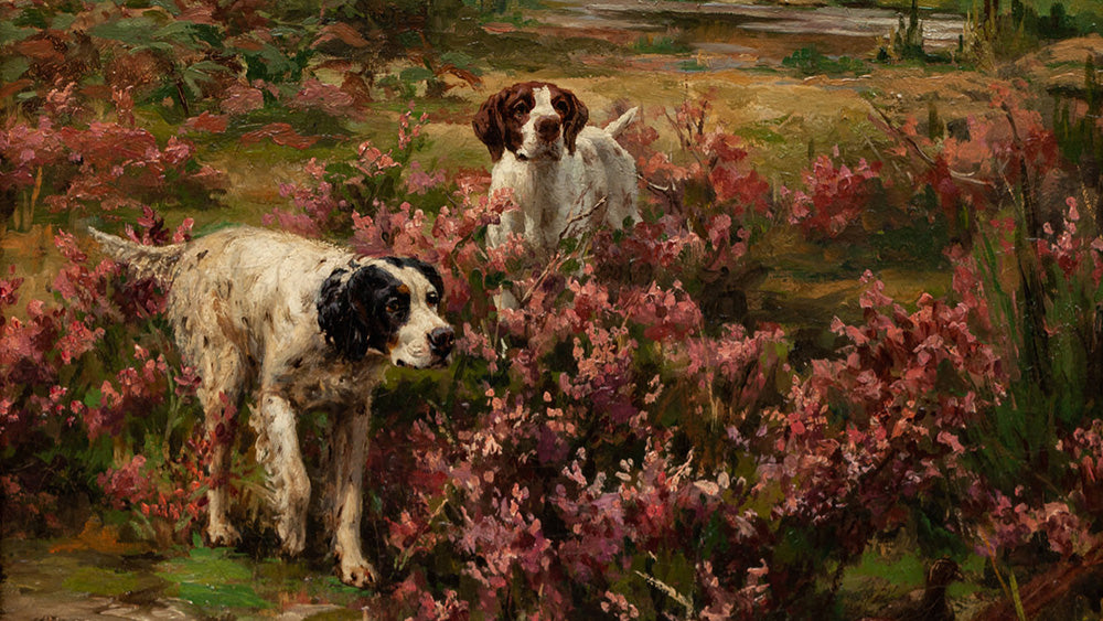 A lovely scene from the early 20th Century features two English Setters in a flowering meadow This print features a stunning balance of warm and cool tones and amazing detail. Frames well in a medium wood tone or antiqued gold.