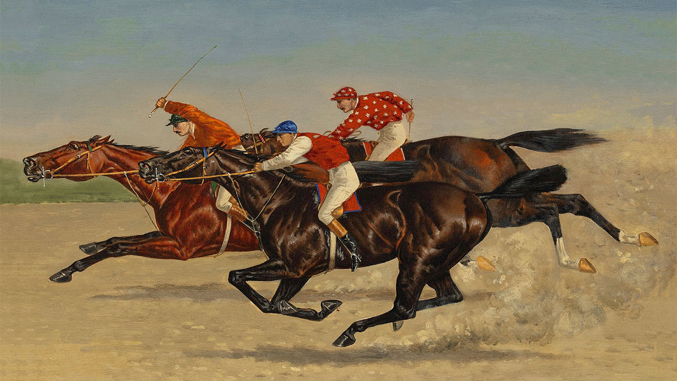 A striking race portrait features three horses and jockeys in full gallop. With rich coloring, this piece frames beautifully in a classic dark frame and classic old-world style gold ornate frames. This item is custom-made to order and available in print or canvas options.