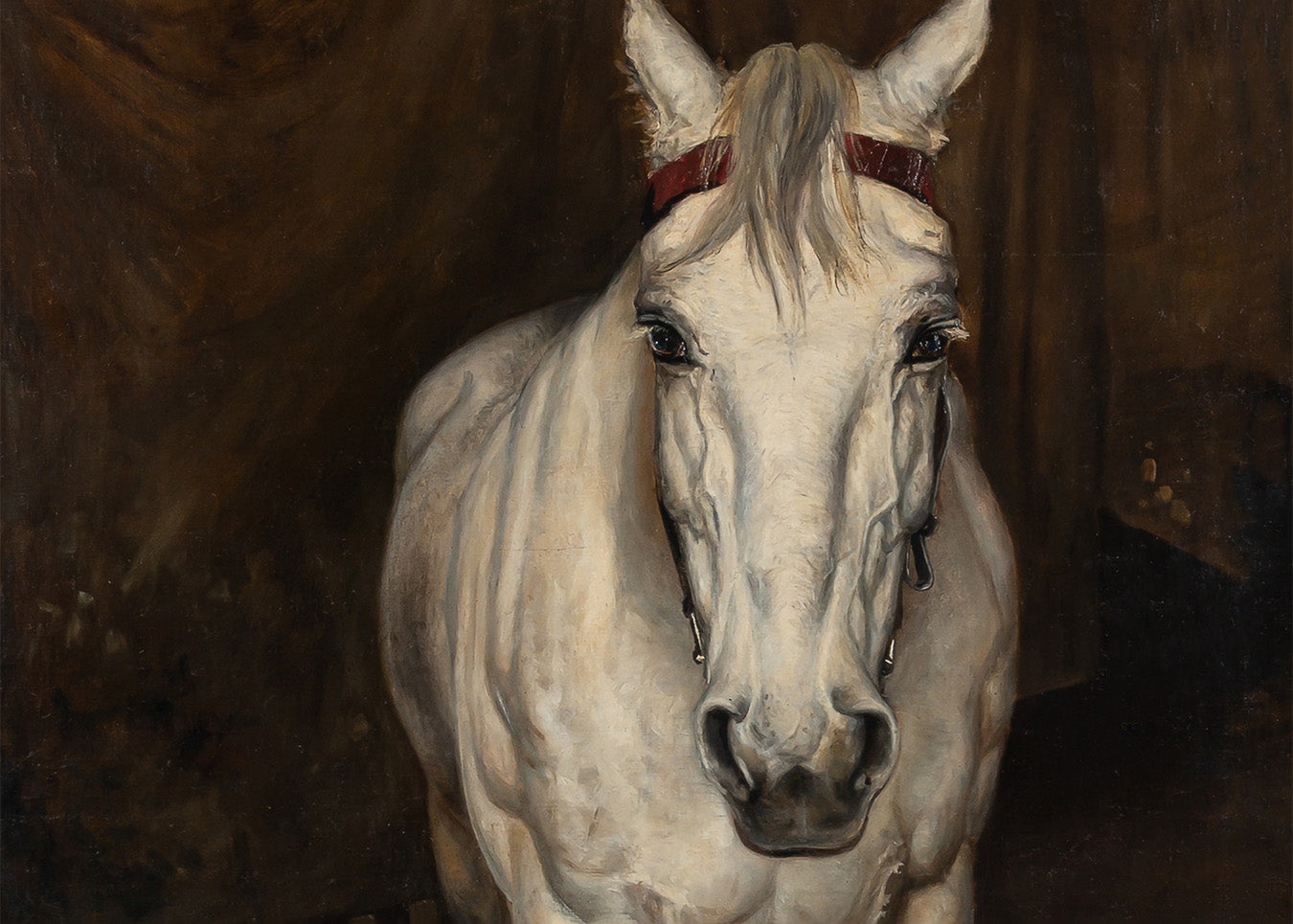 Beautiful 1800's portrait of a grey horse. This portrait features moody brown tones with exquisite detailing. This piece presents beautifully in a dark modern or bronze frame as well as classic old-world style gold ornate frames.