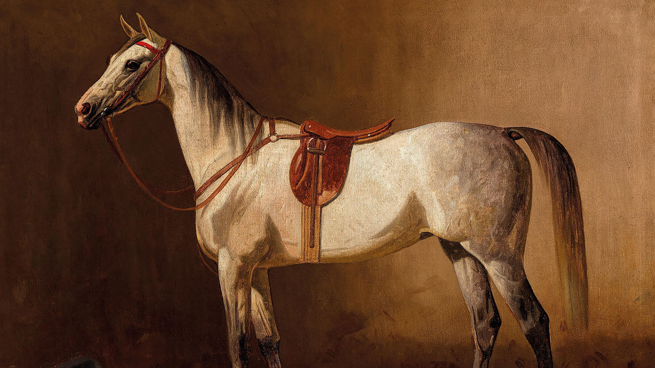 Beautiful 1800's Horse Portrait from Dutch Master, Emil Volkers. This portrait features a beautiful grey, with a vibrant balance of warm and cool tones. Part of the Portrait of a Horse Collection, this piece presents beautifully in a dark modern frame as well as classic old-world style gold ornate frames.
