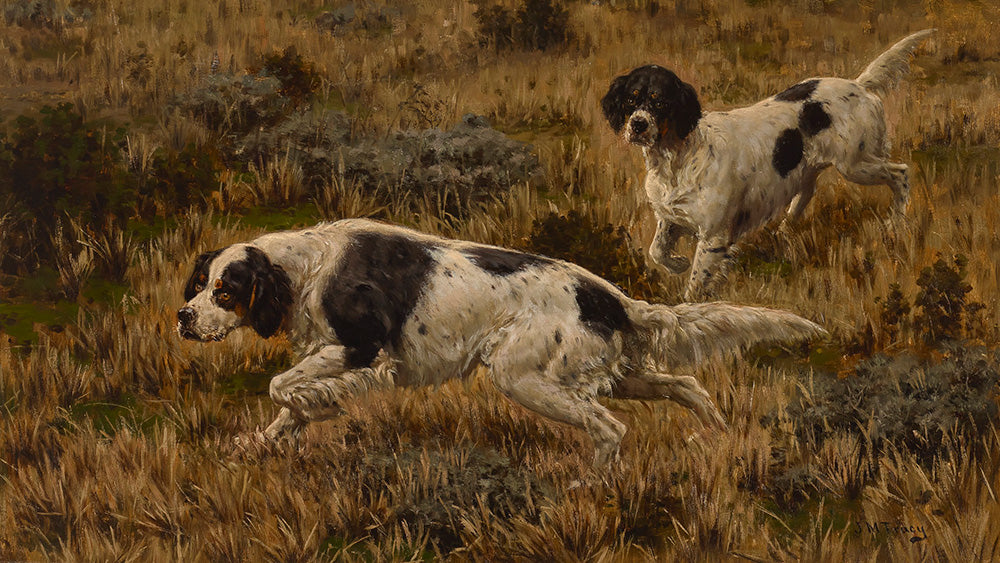 A lovely scene from the early 20th Century features two English Setters and a hunter. This print features a stunning balance of warm and cool tones and amazing detail. Frames well in a medium wood tone or antiqued gold.