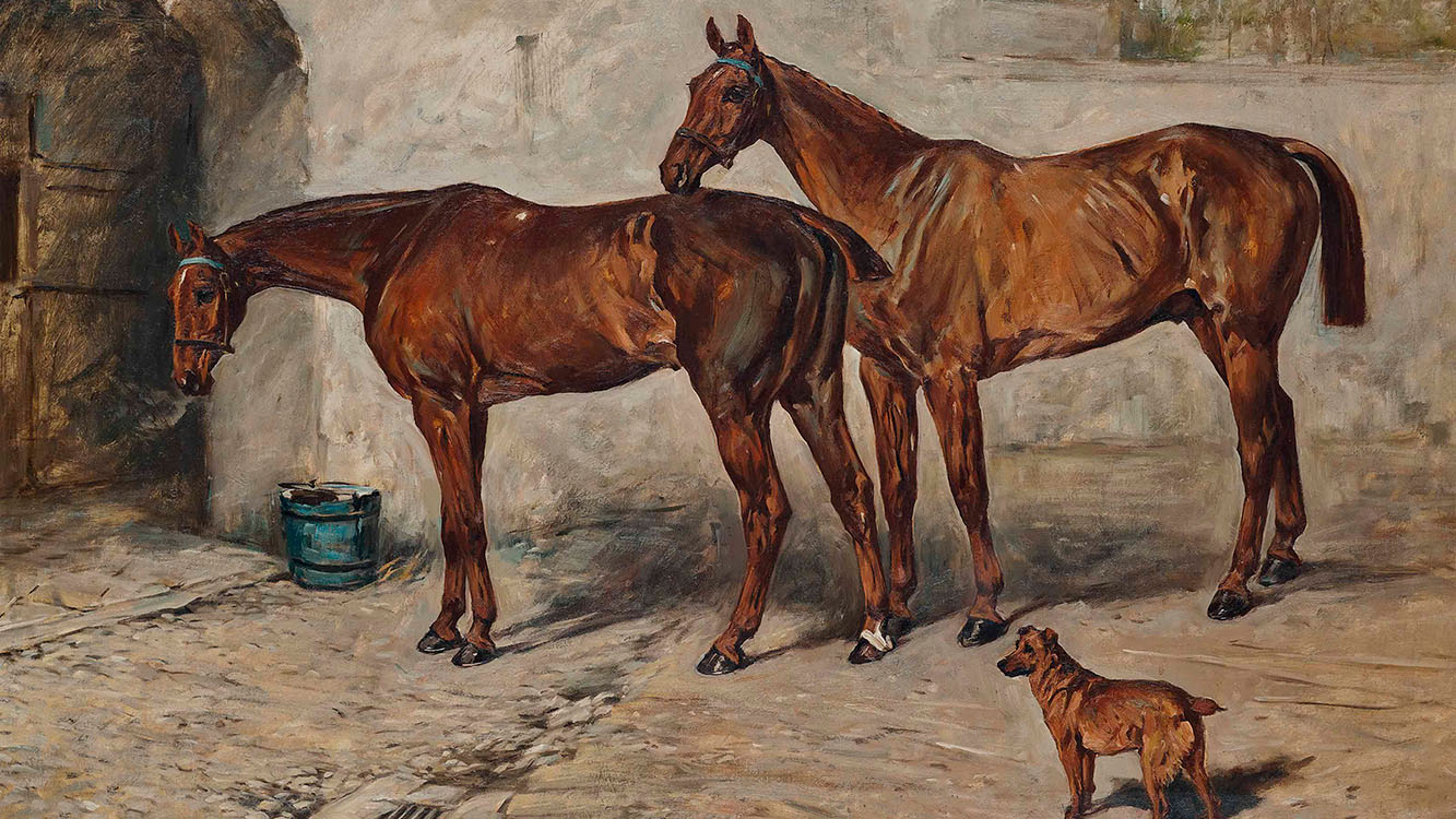 This print is of a beautiful painting by John Emms from the late 1800s. It features two chestnut hunters waiting in the archway of the stables, along with friends. With rich golds and browns and amazing detail, this piece frames beautifully in a medium wood frame as well as classic old-world style gold ornate frames.