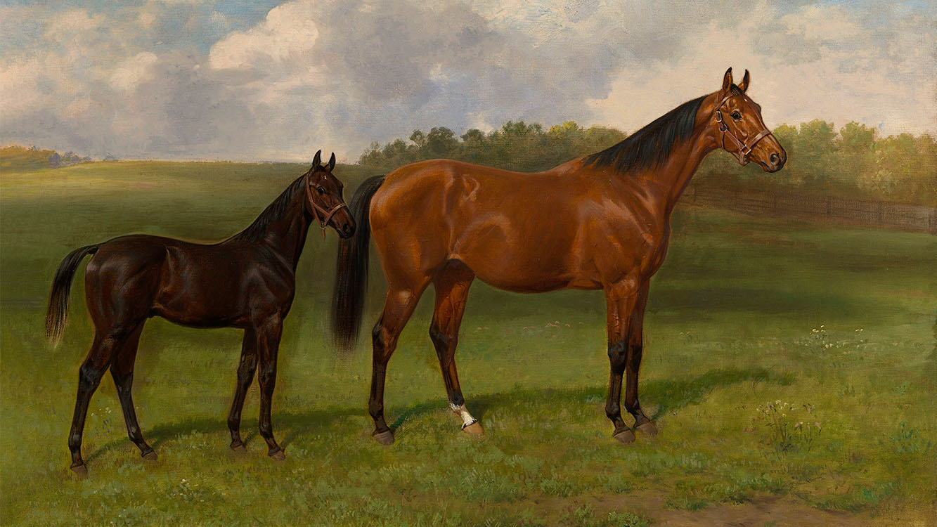 This beautiful 1800s Portrait of a bright bay Mare and her dark bay foal, Sandringham. With rich brown tones balanced with dramatic blues and green, this piece presents beautifully in a dark modern or gold frame as well as classic old-world style gold ornate frames.