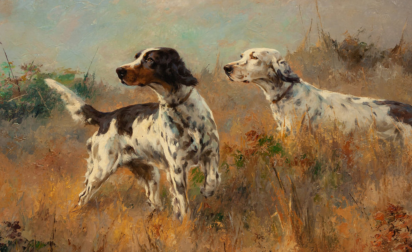 A lovely scene from the early 20th Century features two English Setters in an open field. This print features a stunning balance of warm and cool tones and amazing detail. Frames well in a medium wood tone or antiqued gold.