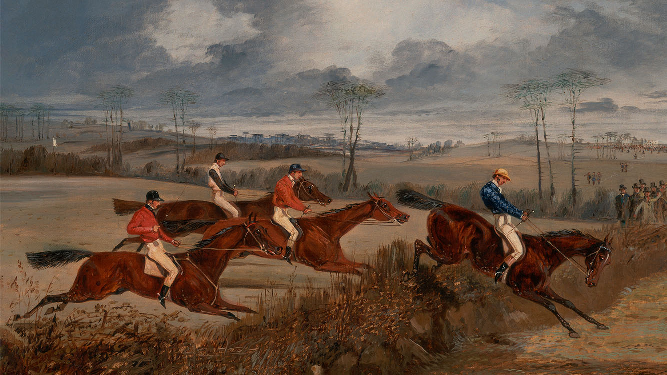 A steeplechase scene features three horses and jockeys leaping a hedge. Part of the Taking the Hedge Collection. With rich coloring, this piece frames beautifully in a classic dark frame and classic old-world style gold ornate frames. This item is custom-made to order and available in print or canvas options.