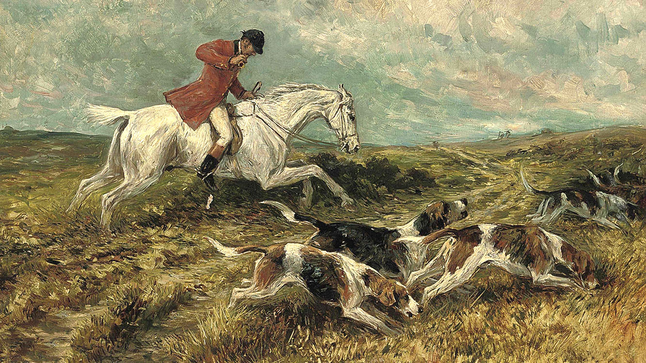 Beautiful English hunting scene from the late 1800s. This painting features a dark bay hunter and two hounds out with the huntsman. With rich golds and browns and amazing detail, this piece frames beautifully in a medium wood frame as well as classic old-world style gold ornate frames.
