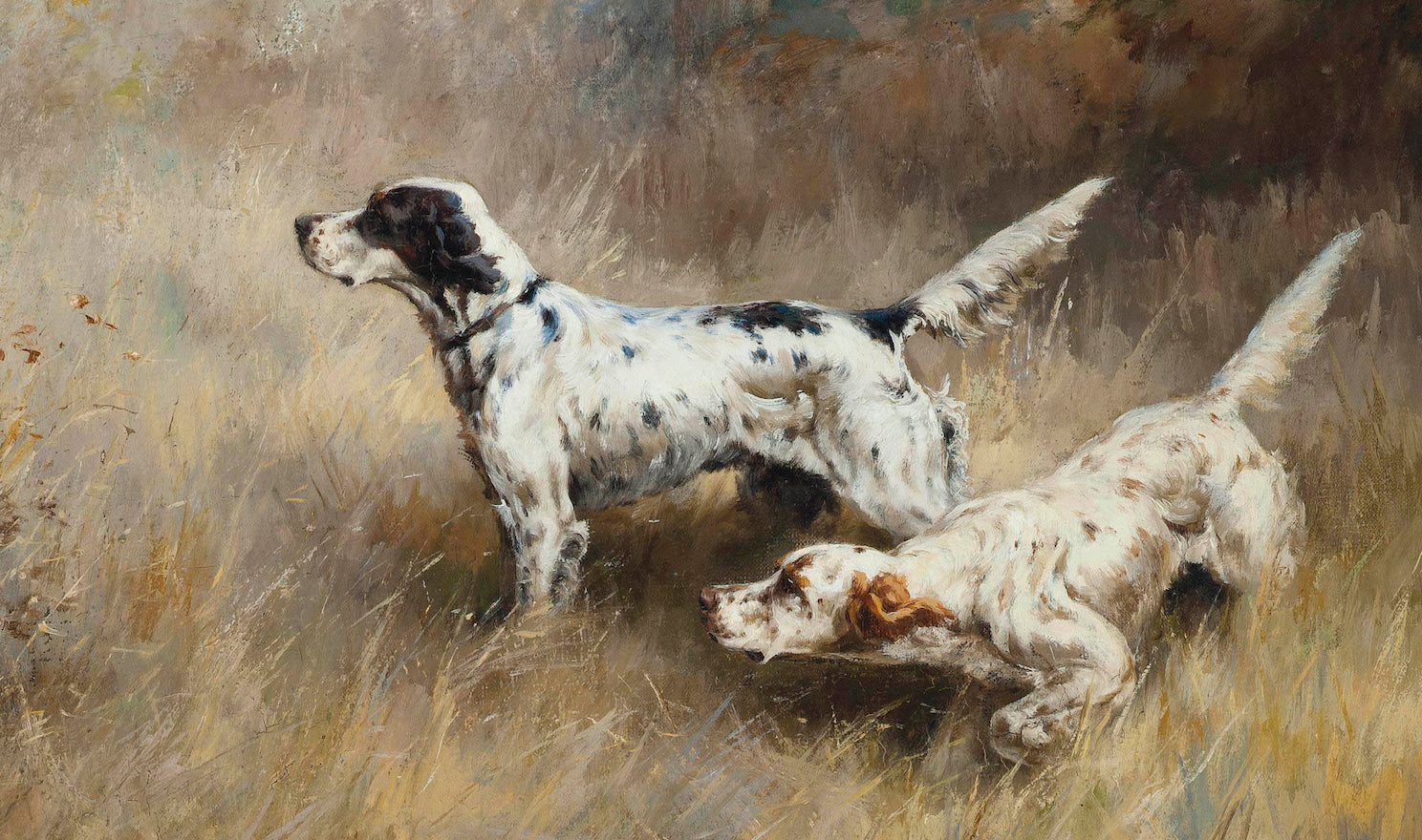 A lovely scene from the early 20th Century features two setters as they exit the brush. This print features a stunning balance of warm and cool tones and amazing detail. Frames well in a medium wood tone or antiqued gold.