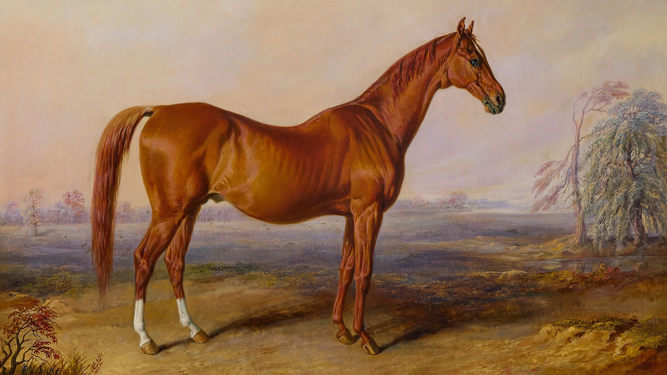 Beautiful 1800s Horse Portrait of an unsaddled chestnut Thoroughbred by American painter Edward Troye. This portrait features a beautiful horse in a pasture with rich gold and brown tones. This piece presents beautifully in a dark modern or gold frame as well as classic old-world style gold ornate frames.