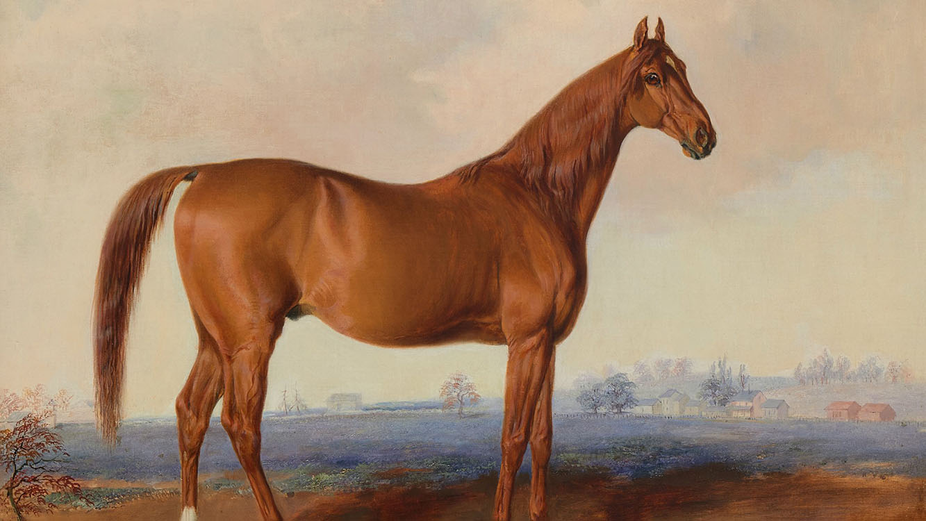Beautiful 1800s Horse Portrait of an unsaddled chestnut Thoroughbred by American painter Edward Troye. This portrait features a beautiful horse in a pasture with rich gold and brown tones. This piece presents beautifully in a dark modern or gold frame as well as classic old-world style gold ornate frames.