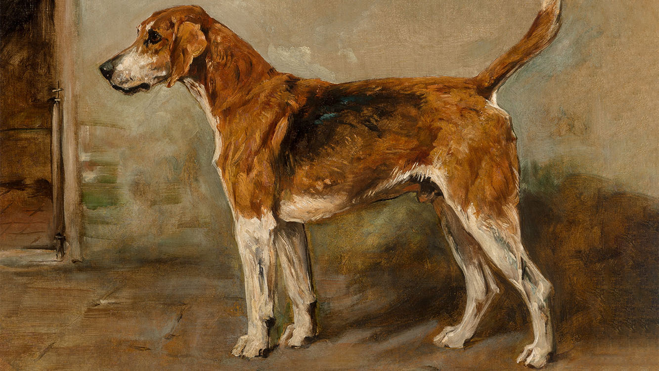 Gorgeous vintage foxhound portrait by 19th century English painter John Emms, known for his works of dogs. This print is soft and natural with rich browns and creamy whites. This piece frames beautifully in a medium wood frame as well as a classic old-world style ornate aged gold or bronzed frame.