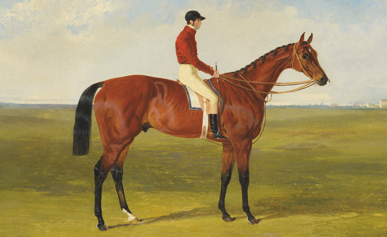 Striking race scene, this portrait features a jockey mounted on a bright bay racehorse known as Nutwith. Nutwith won the 1843 St Leger as a 15-1 outsider, against the favorite Cotherstone. With rich coloring and extraordinary detail, this piece frames beautifully in a classic dark frame as well as classic old-world style gold ornate frames.