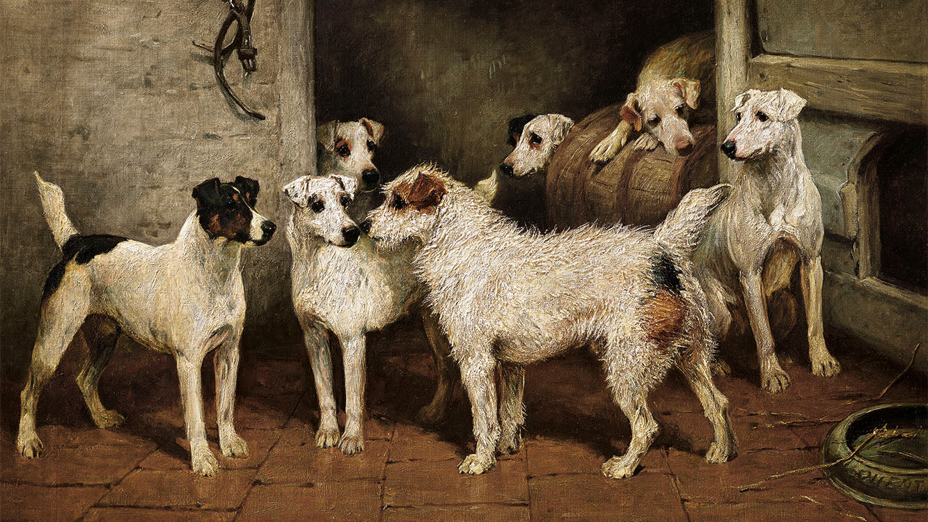 Gorgeous vintage terriers by 19th century English painter John Emms, known for his works of dogs, particularly Foxhounds and Terriers. This print is soft and natural with rich browns and creamy whites. This piece frames beautifully in a medium wood frame as well as a classic old-world style ornate aged gold or bronzed frame.