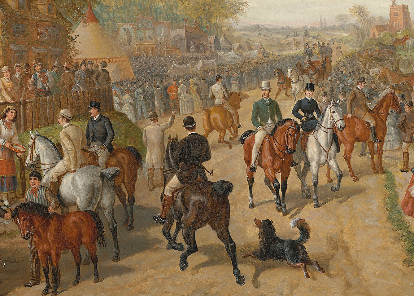 Beautiful 1800's scene features an extraordinary town festival with 100s of horses, riders, and townspeople. This piece presents beautifully in a bright modern frame as well as classic old-world style gold ornate frames.
