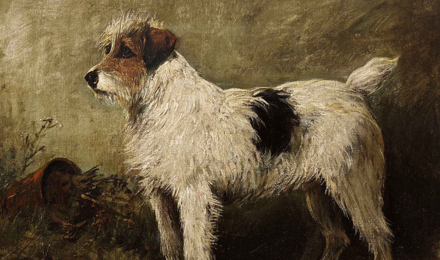 Gorgeous vintage wire terrier portrait by 19th century English painter John Emms, known for his works of dogs, particularly Foxhounds and Terriers. This print is soft and natural with rich browns and creamy whites. This piece frames beautifully in a medium wood frame as well as a classic old-world style ornate aged gold or bronzed frame.
